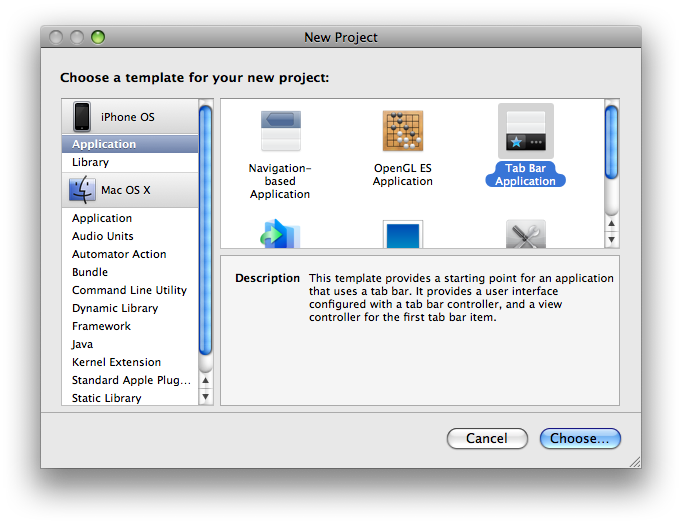 - Choose any iPhone project you like but I chose “Tab Bar Application”