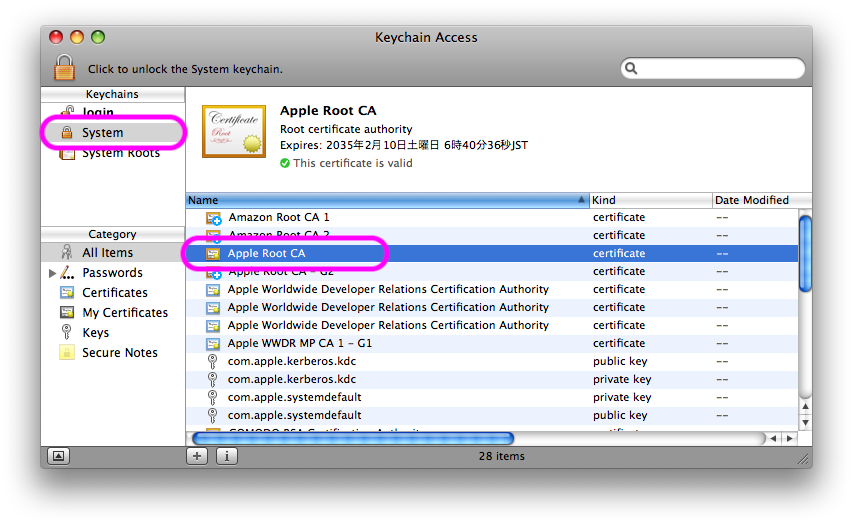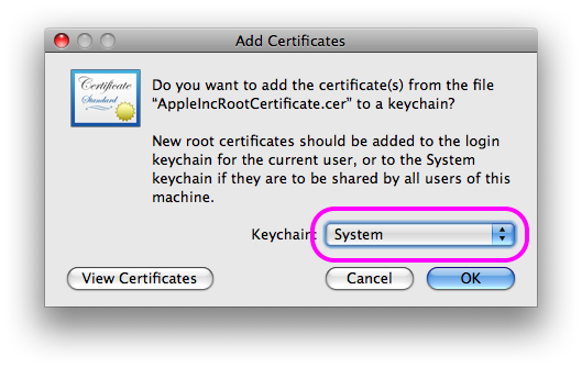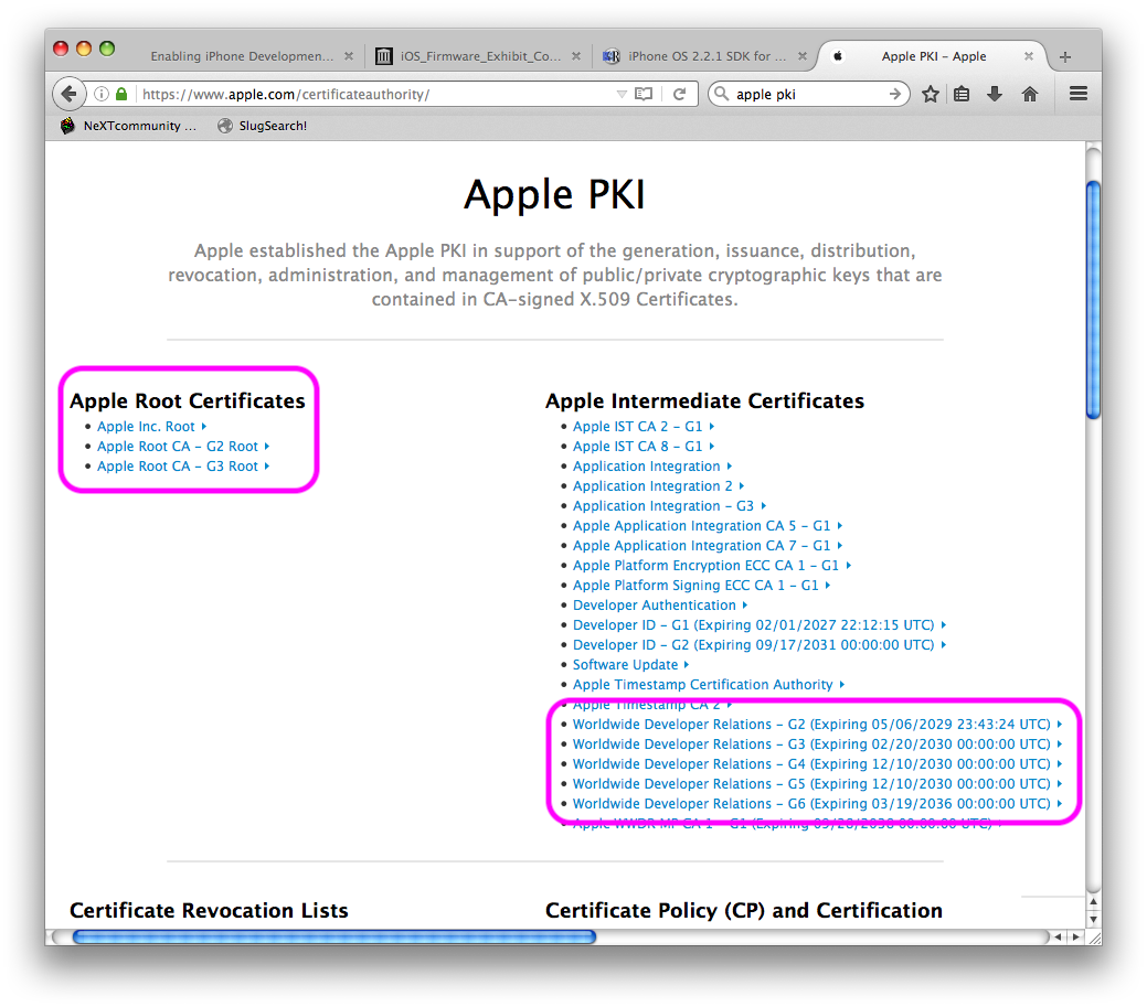 Before any of this will work, we need to make sure your ancient version of Mac OS X is loaded with the latest Apple Certificate Authorities and Intermediate Certificates that Apple uses for signing its development certificates.