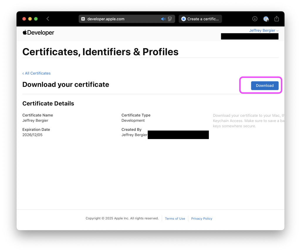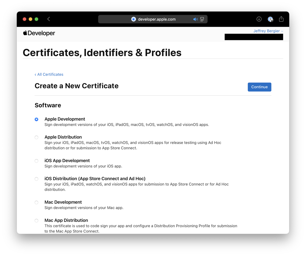 - Open Apple Developer Portal - Certificates and click the + button next to Certificates