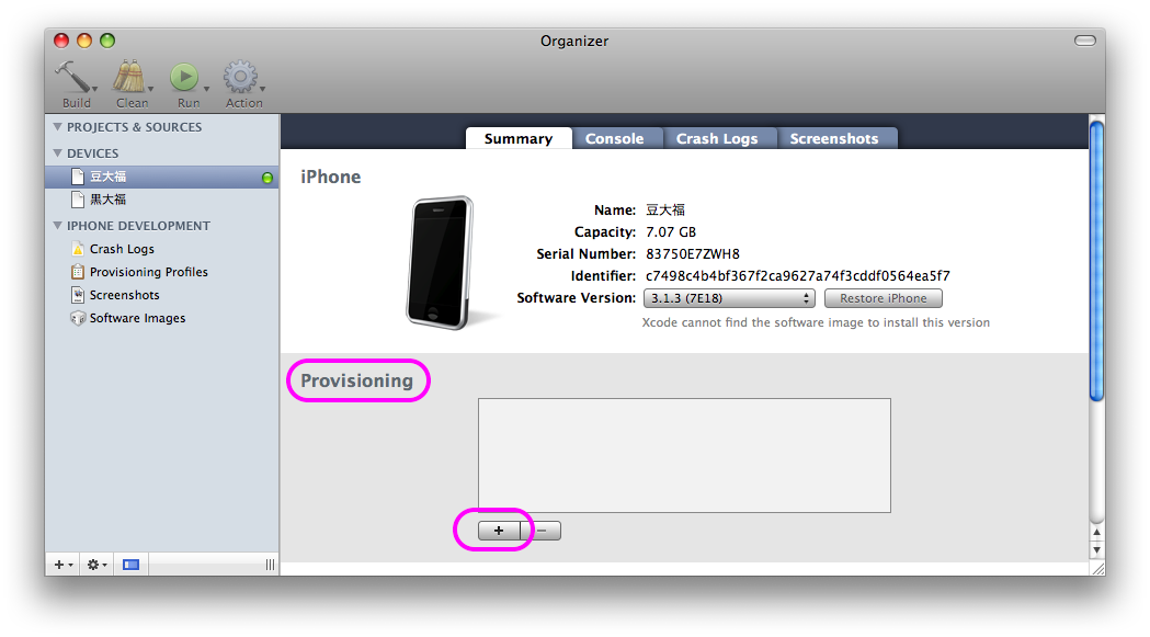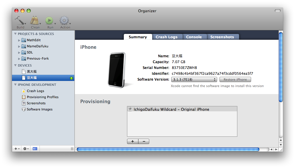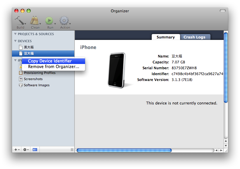 - Organizer: In Xcode, choose Window→Organizer and then plug in your device