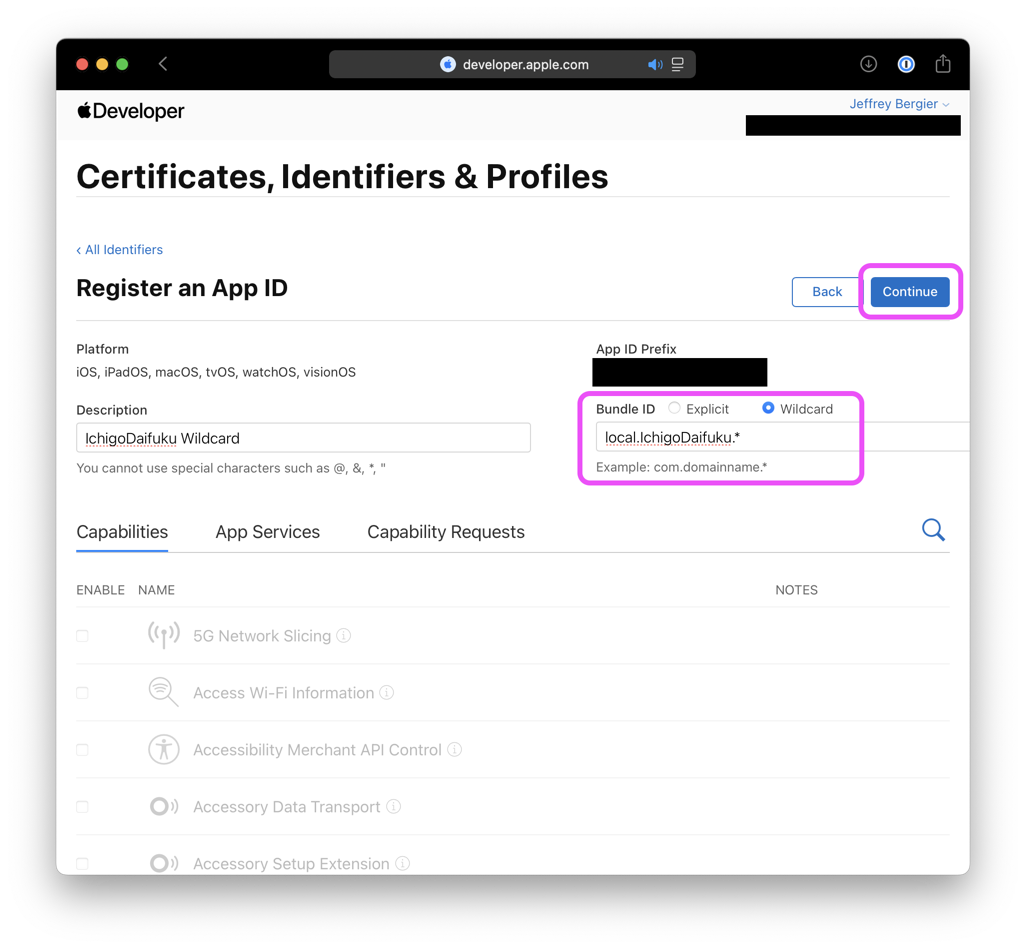 - When it asks you for the bundle identifier click the “Wildcard” radio button and type in your identifier