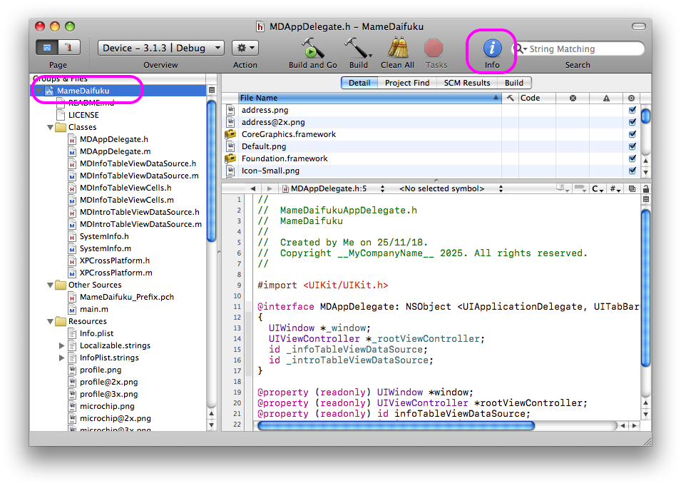 - Open the Build Settings by selecting the project file at the top of the Groups & Files pane and then click on Info in the toolbar