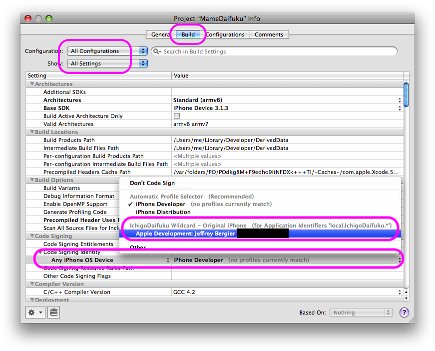 - In the Build Settings panel, look for Code Signing Identity, and choose the provisioning profile you created in Step 5 and then close the info panel