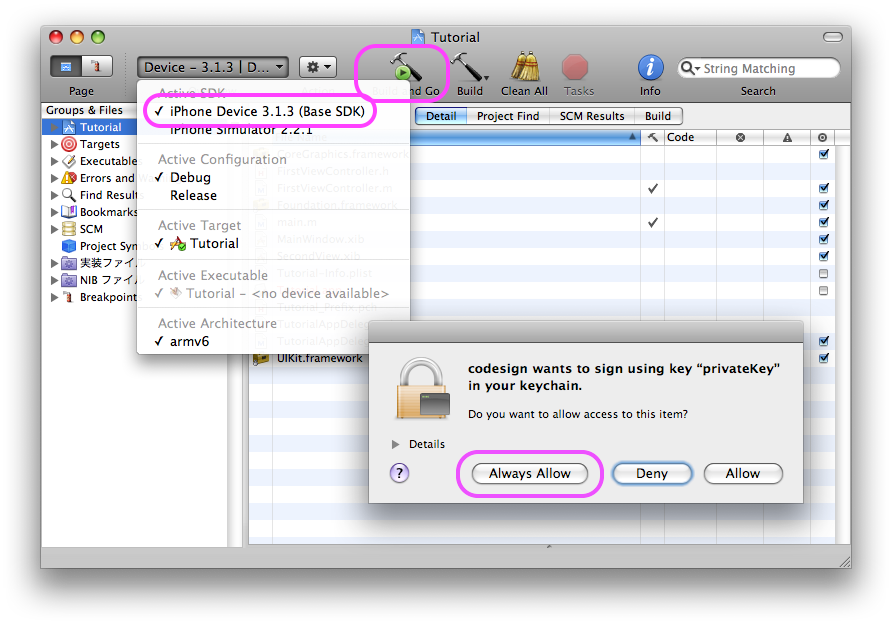 | Info.plist | Build Settings 1 | Build Settings 2 | Build and Go | No Device Error |