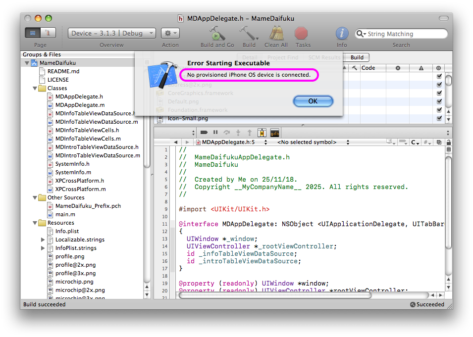 If you receive the “No provisioned iPhone OS device is connected” error, you have succeeded, congratulations! You have just gone through the really tedious task the Apple created for all iPhone developers back in 2008. Now Xcode is 100% ready to deploy your custom Apps to a real iPhone!