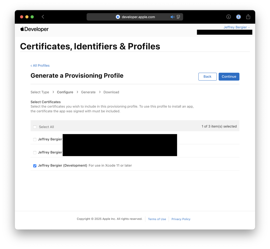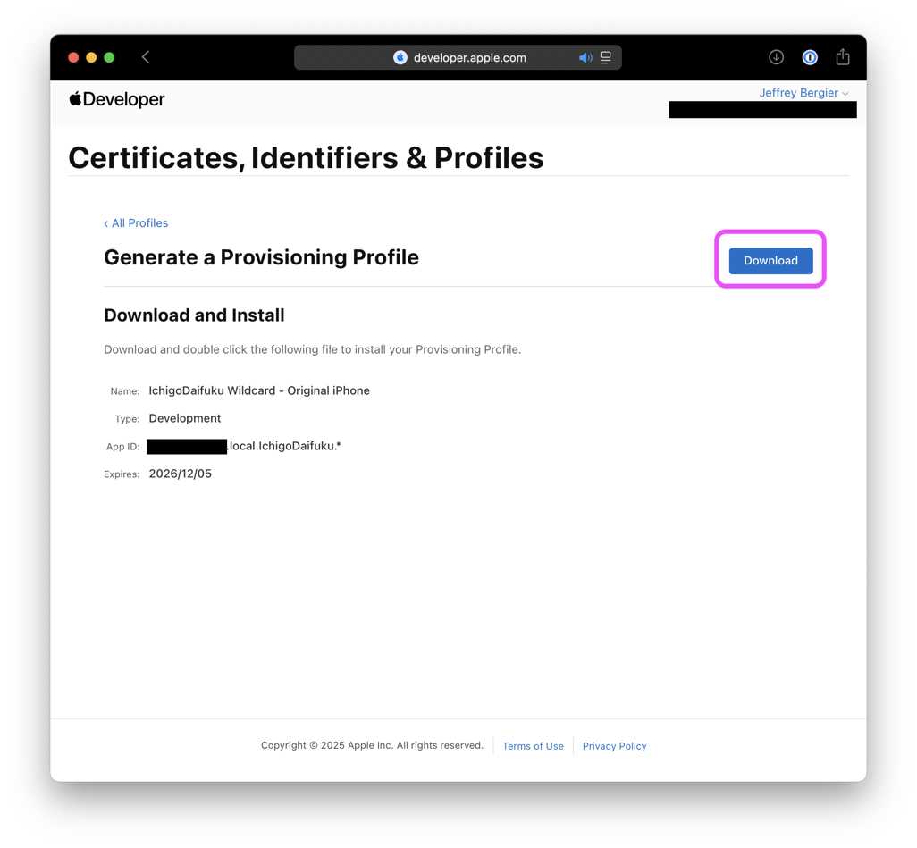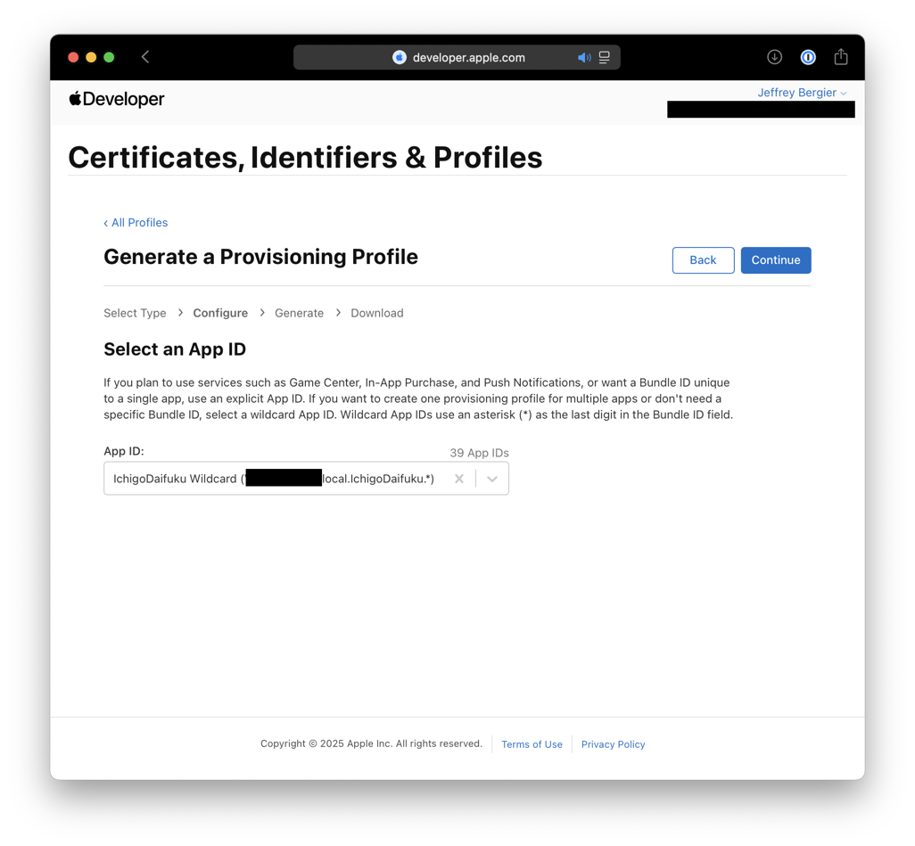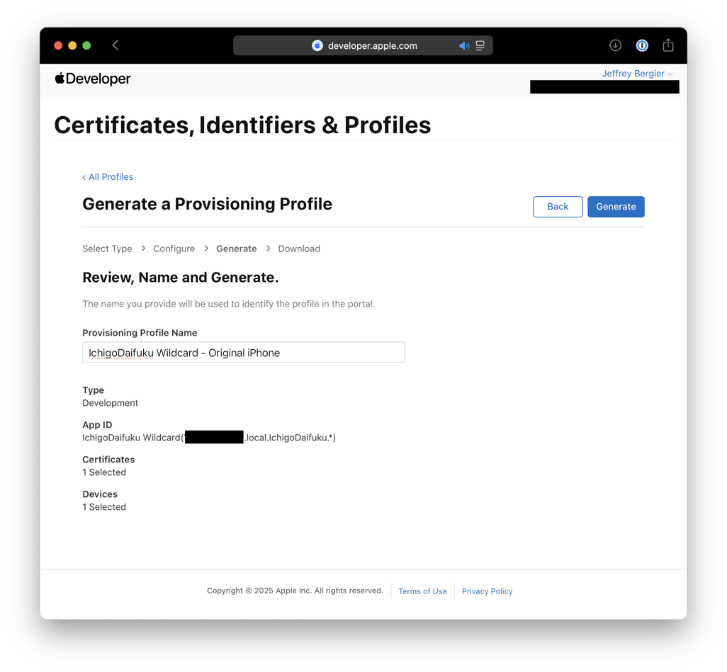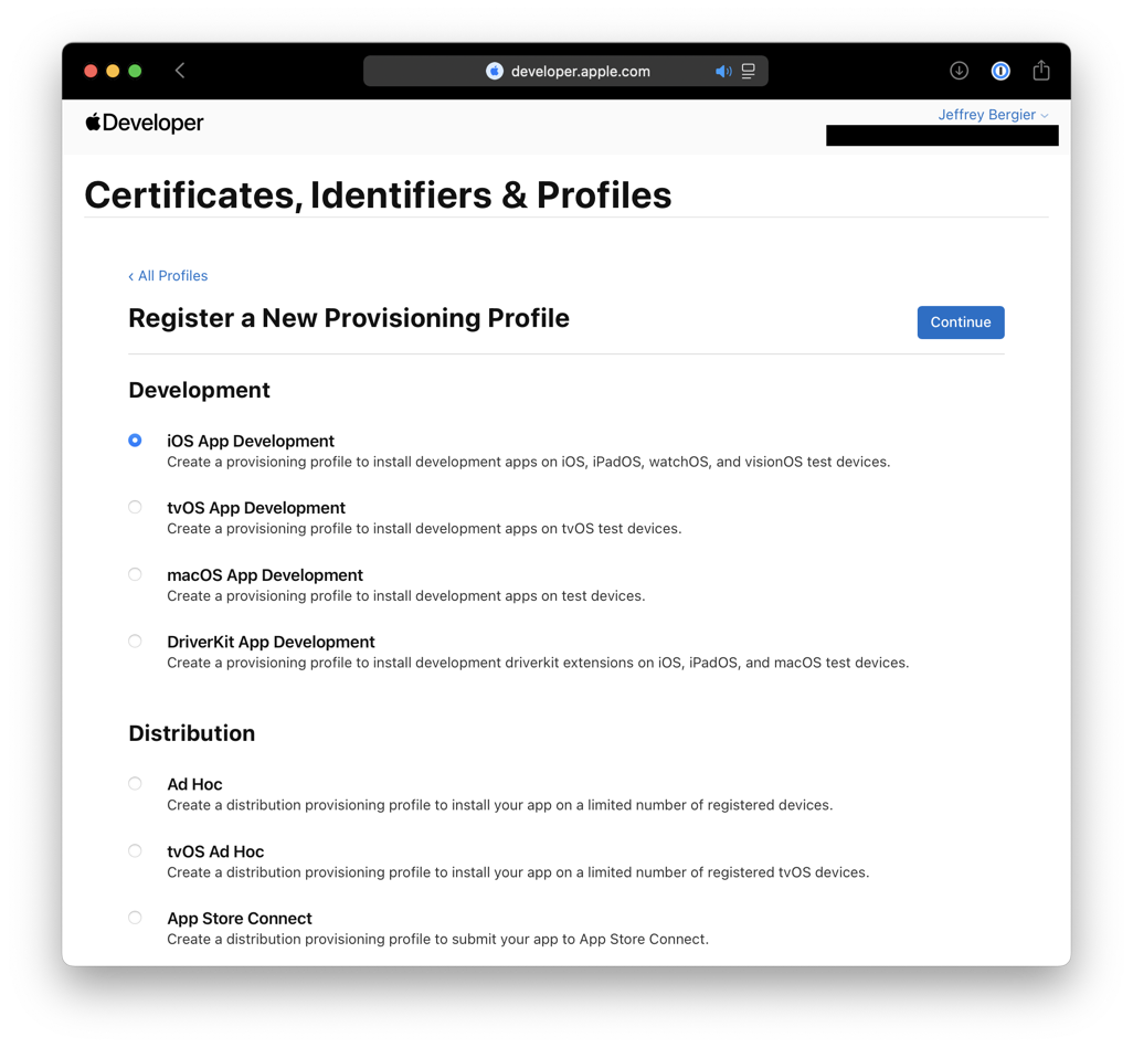 Now you are going to create the provisioning profile. This step combines the signing certificate (Step 2), the app identifier (Step 3), and the device identifier (Step 4) into the final step. Please be very careful when going through the prompts on the Apple Developer Portal as any mistake will make the provisioning profile invalid.