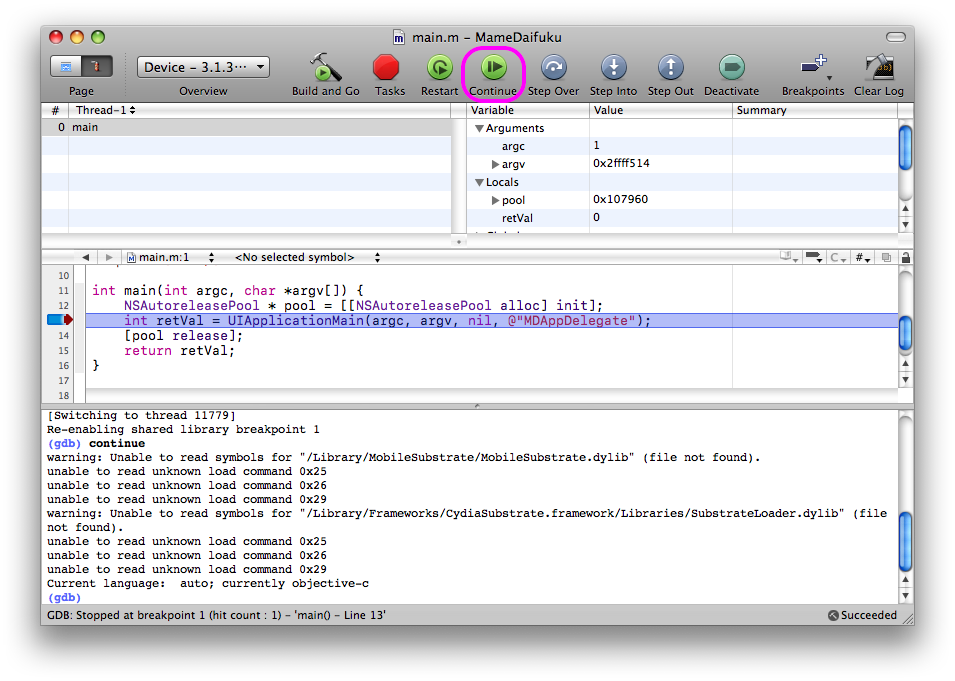 - In Xcode you will see the breakpoint was hit, click the Continue button